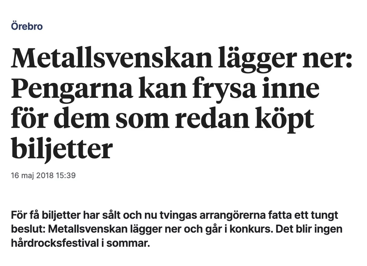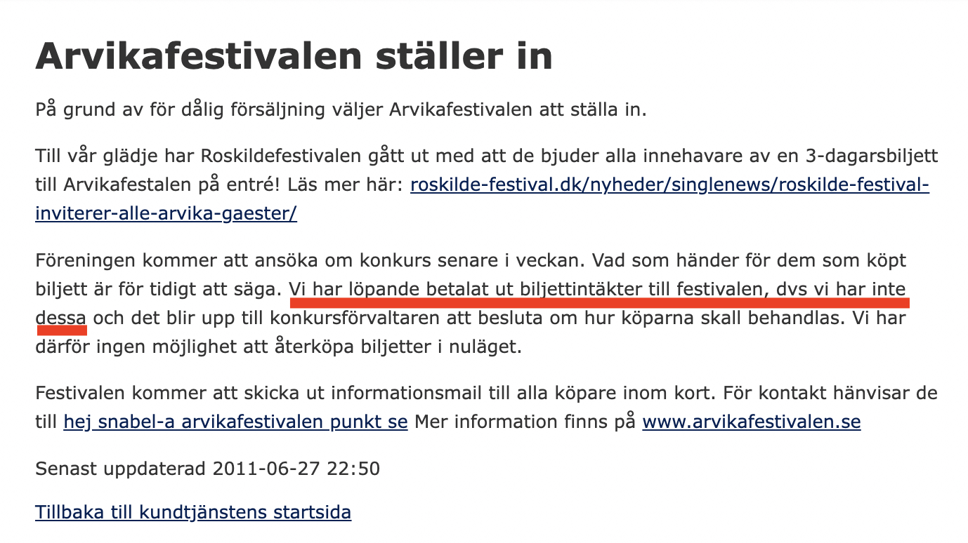 I vårt fall handlar det dock inte om obestånd eller konkurs – utan om att Tickster själva, utan saklig grund, stoppade utbetalningar och därmed direkt orsakade att över 60 konserter och festivaler fick ställas in.